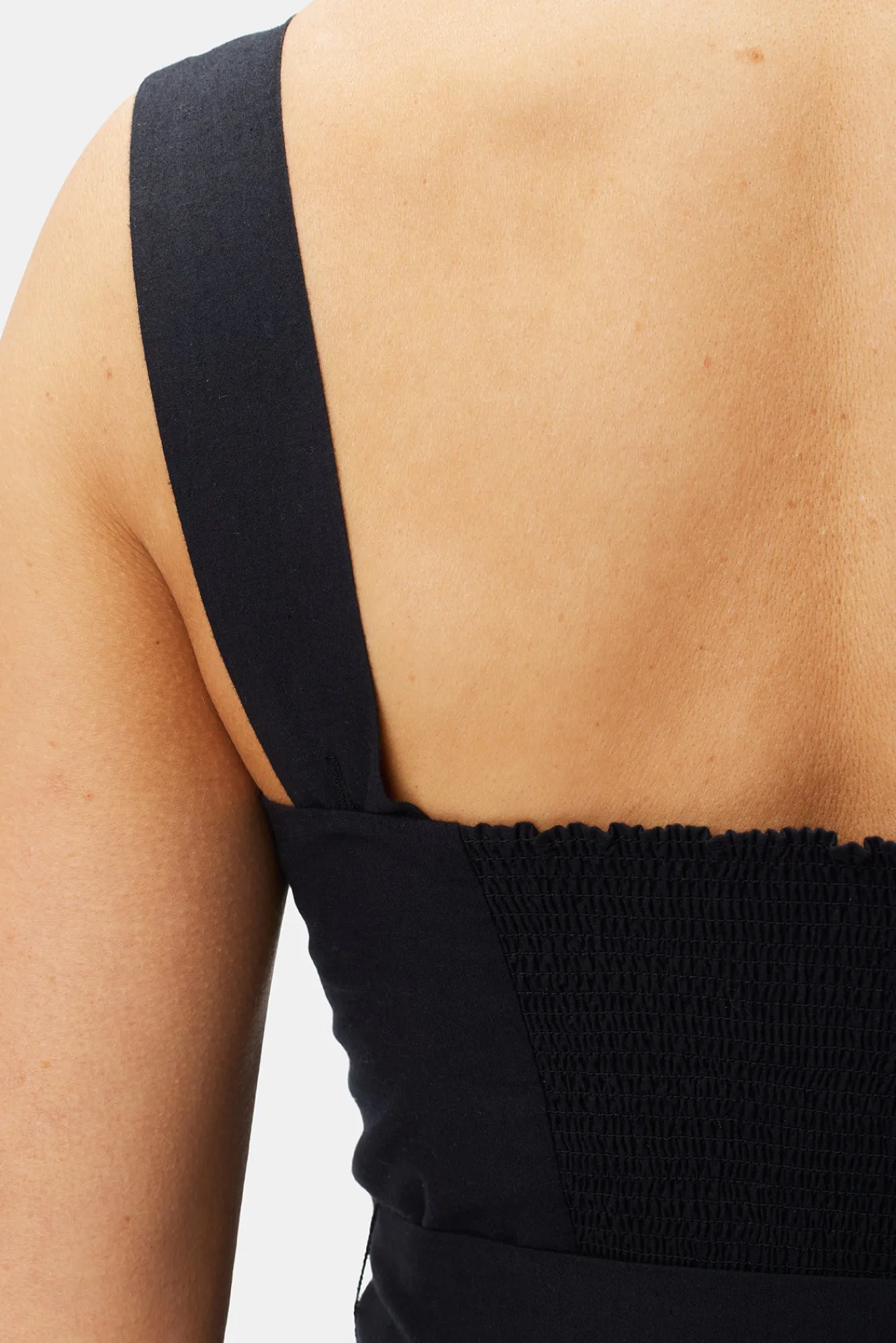 - Square neck sleeveless dress with a fitted waist and button-front bodice, smocking at the back for adjustability.