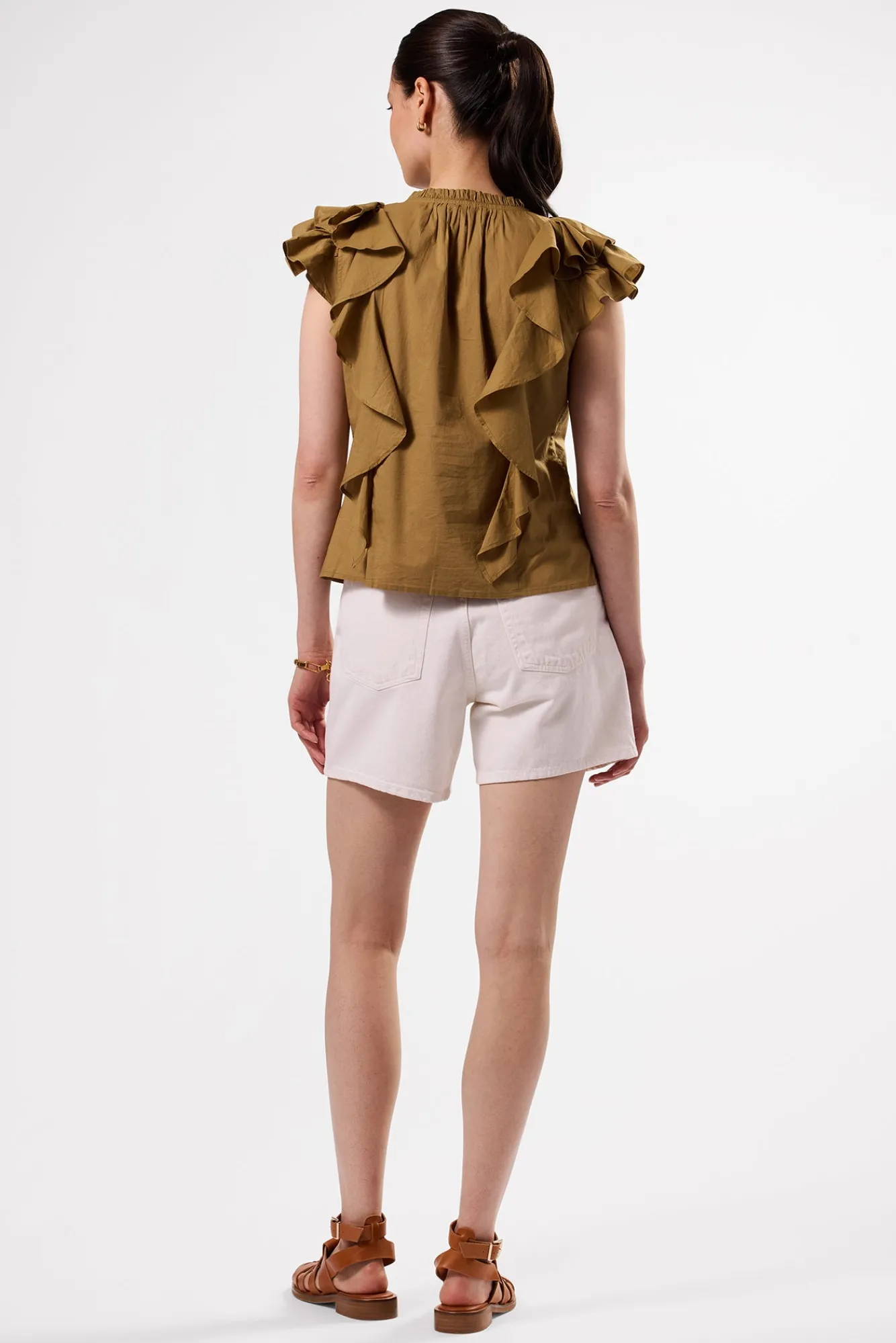 A ruffled sleeve adds a Parisian charm to this quintessential summer blouse. Light and airy in organic cotton cambric.