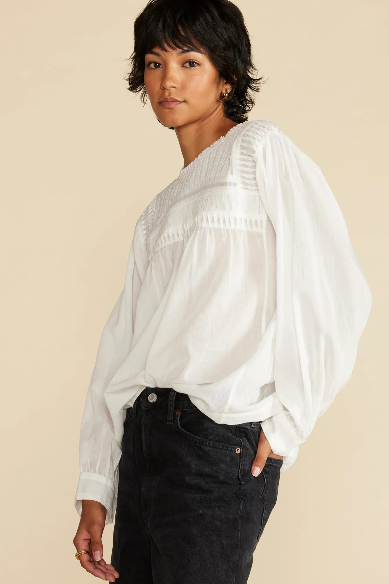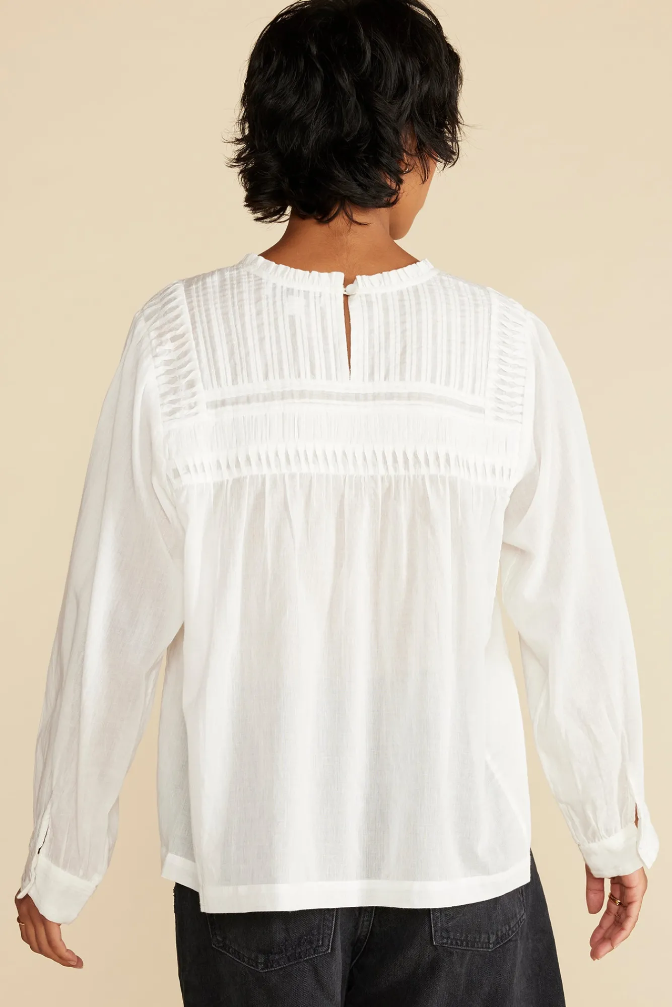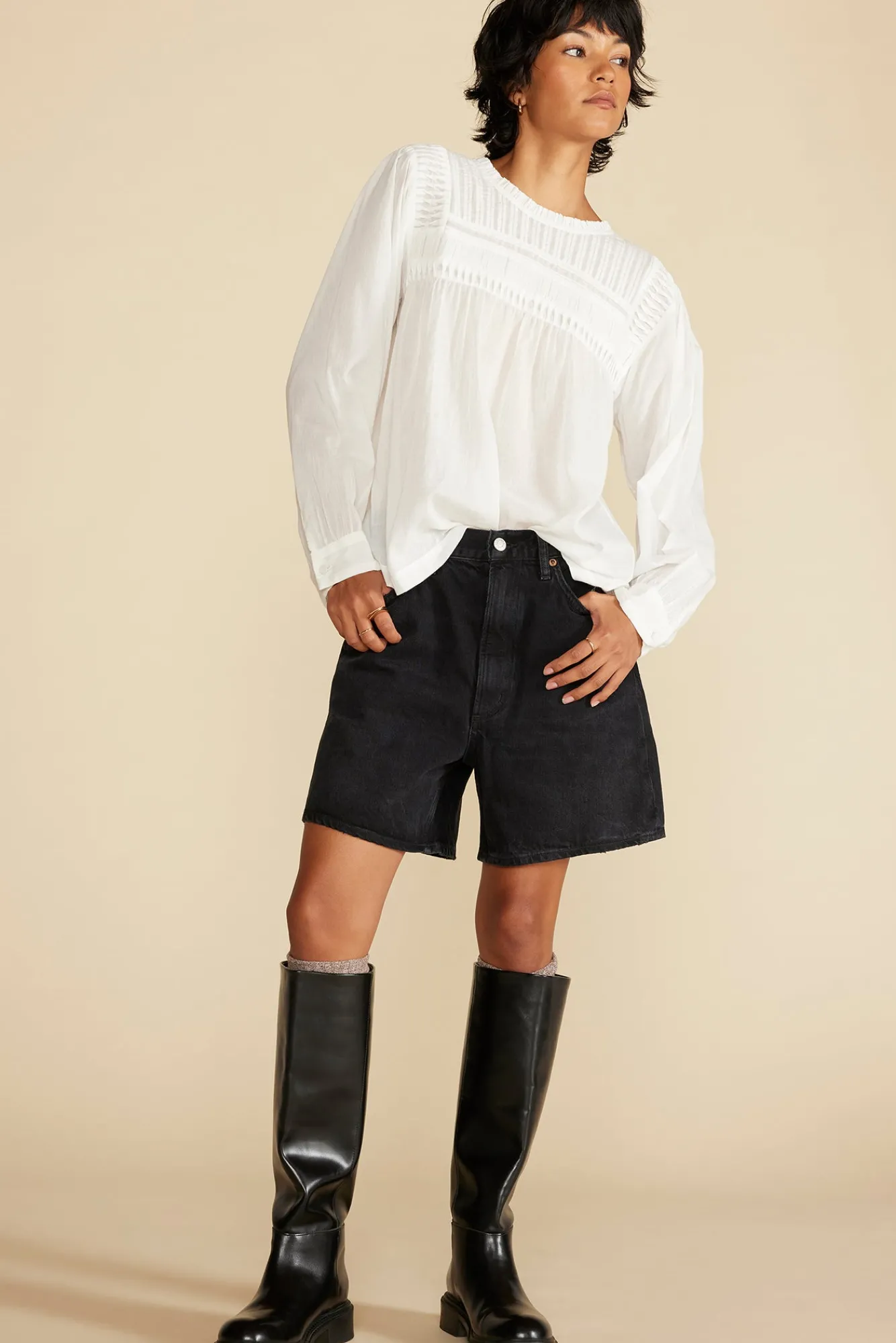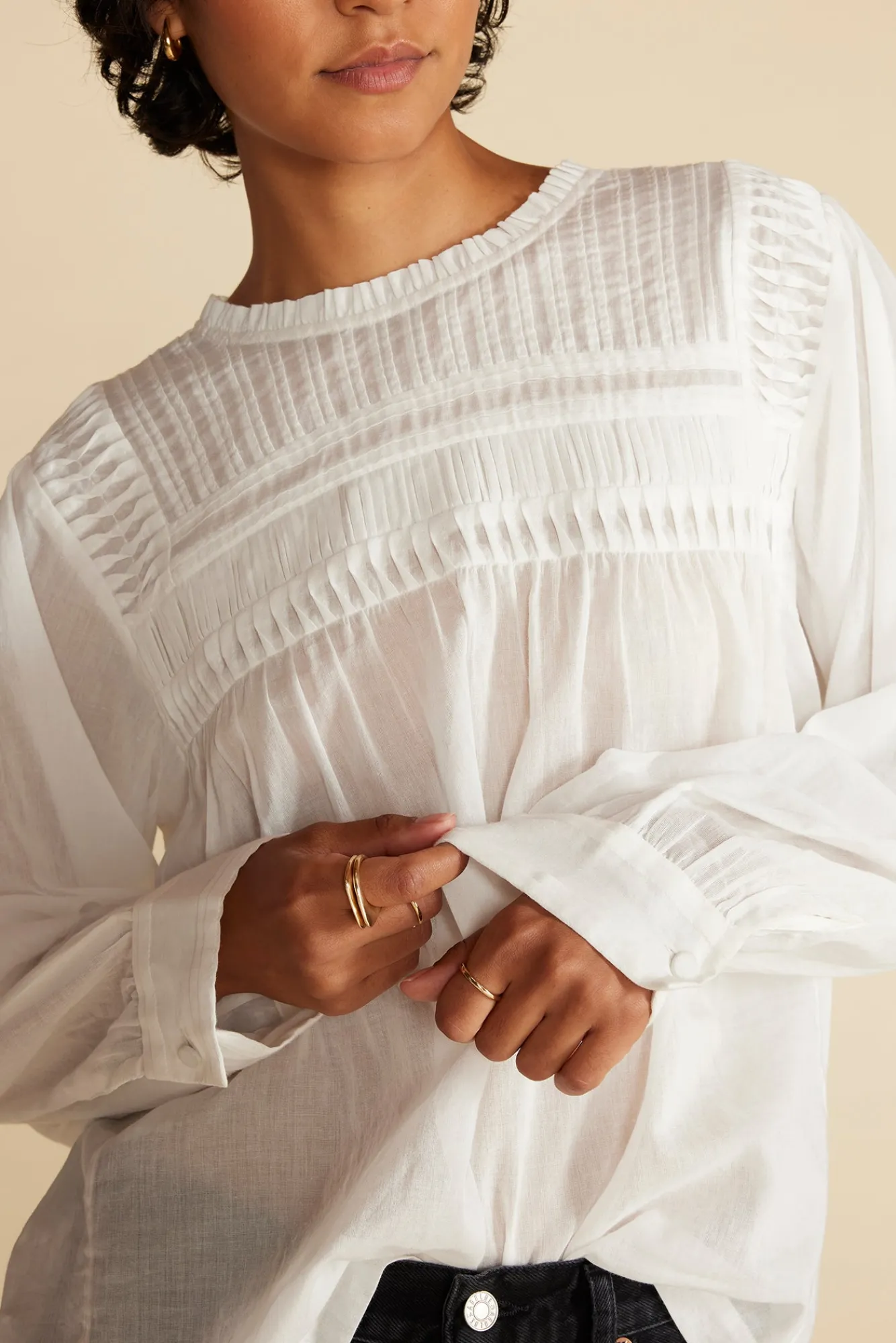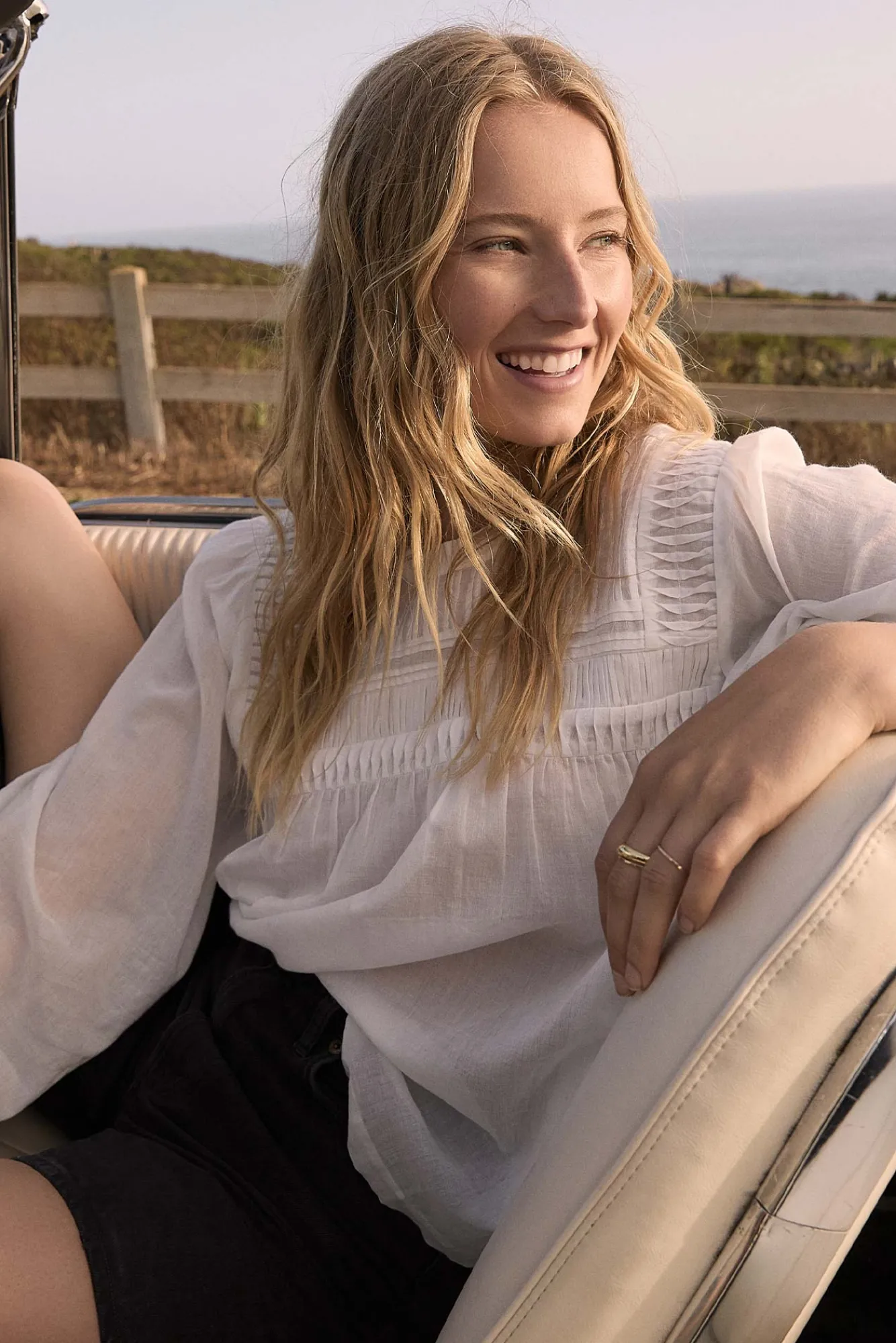 A romantic blouse with a touch of boho, Aida’s organic cotton-voile is a showcase for intricate pin-tuck pleats, ruffles, and ruching. Balance the breezy fit with a pair of high-waist pants.