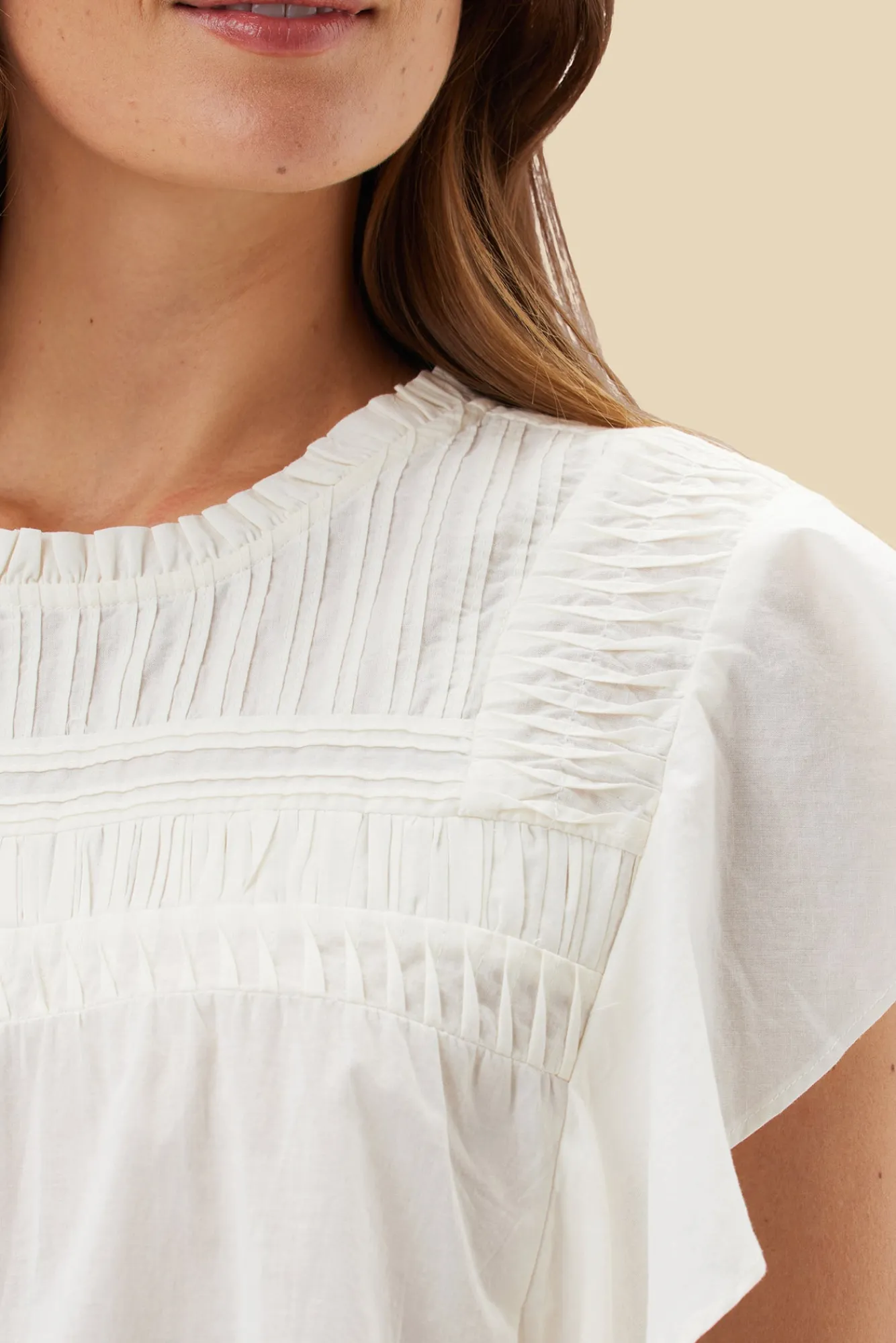 Timeless and feminine. The Aida Blouse, crafted in organic cotton with beautiful pin tucking and ruffle details, exudes a subtle romantic charm.