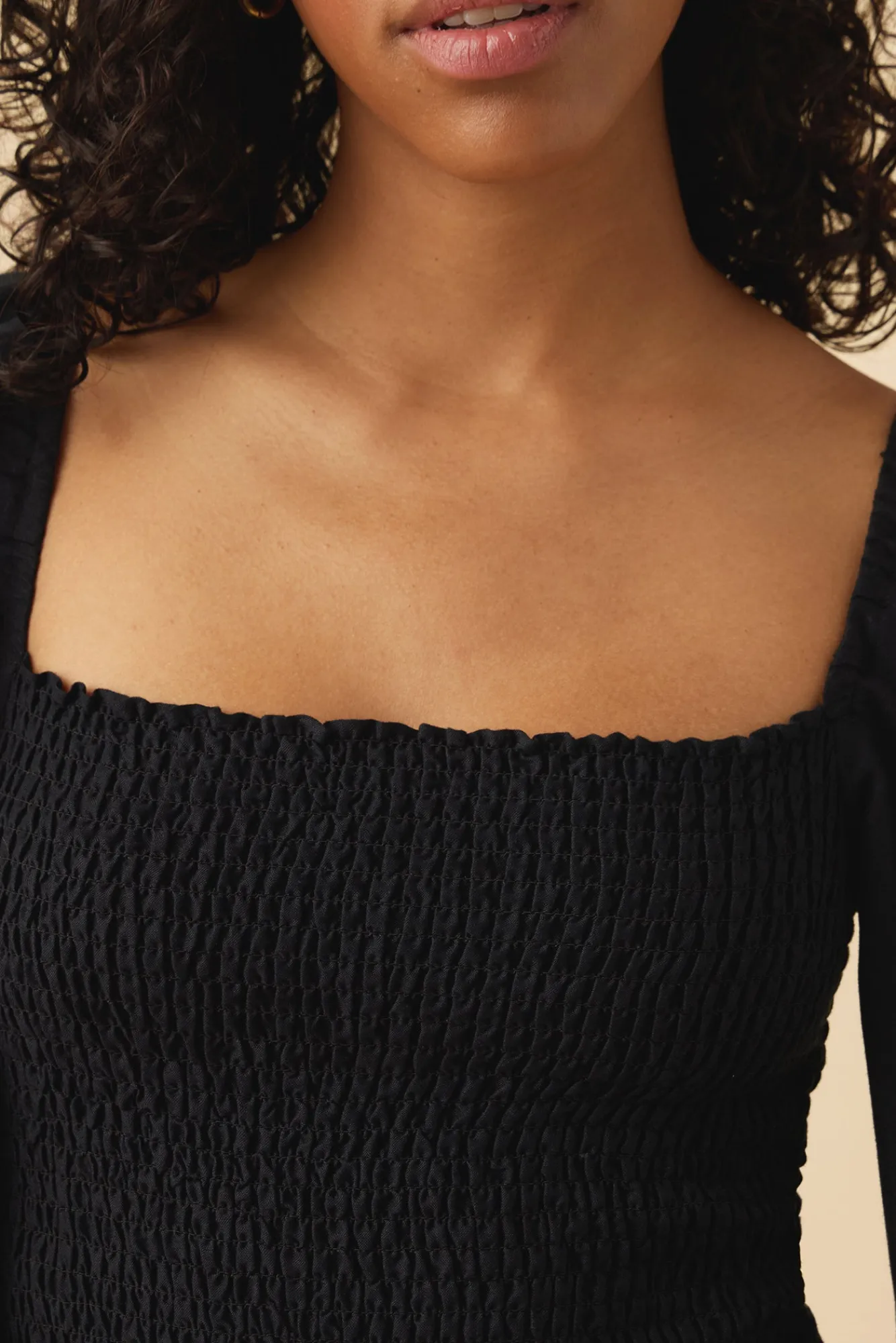 - Casual summer dress features fully smocked, slim fitting bodice, square neck line, elastic shoulder, ruffle detail at cuff and puffy 3/4 sleeve.
