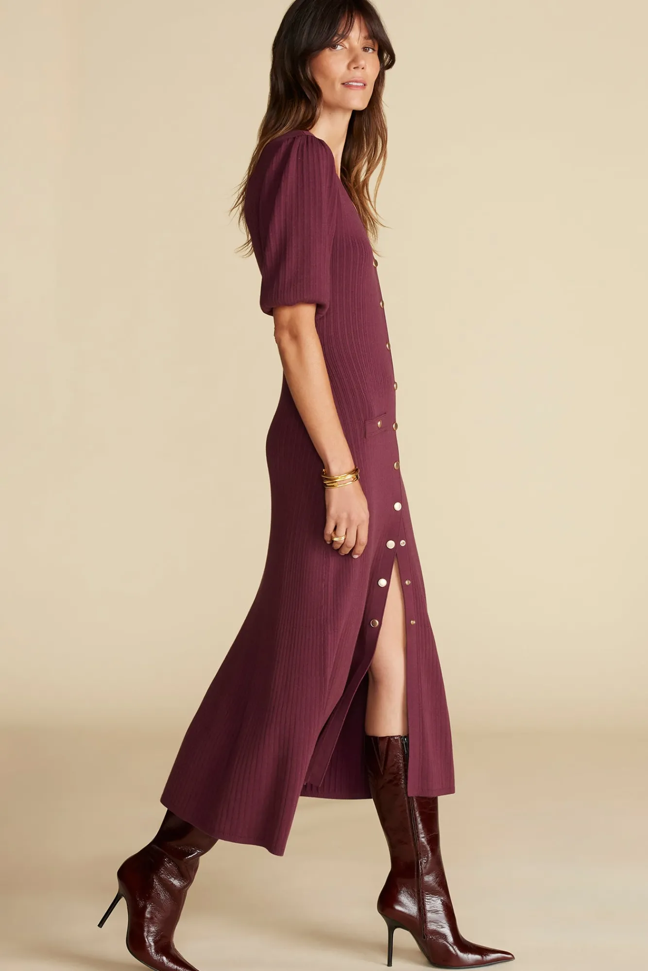 – Knit shirtdress with a ribbed texture, button front, puffed sleeves, pocket details at the hips, midi length.