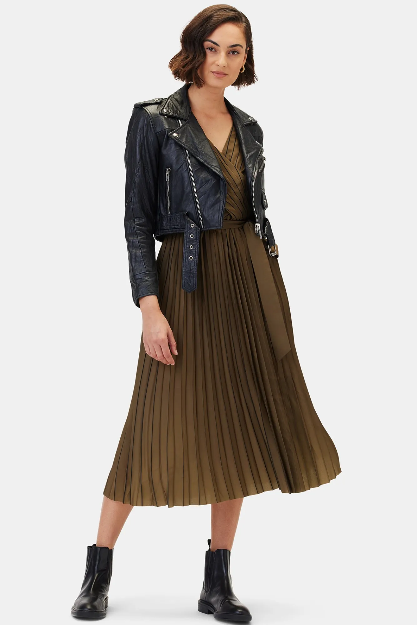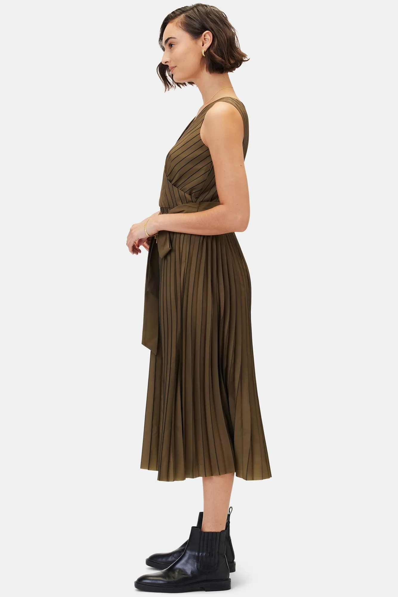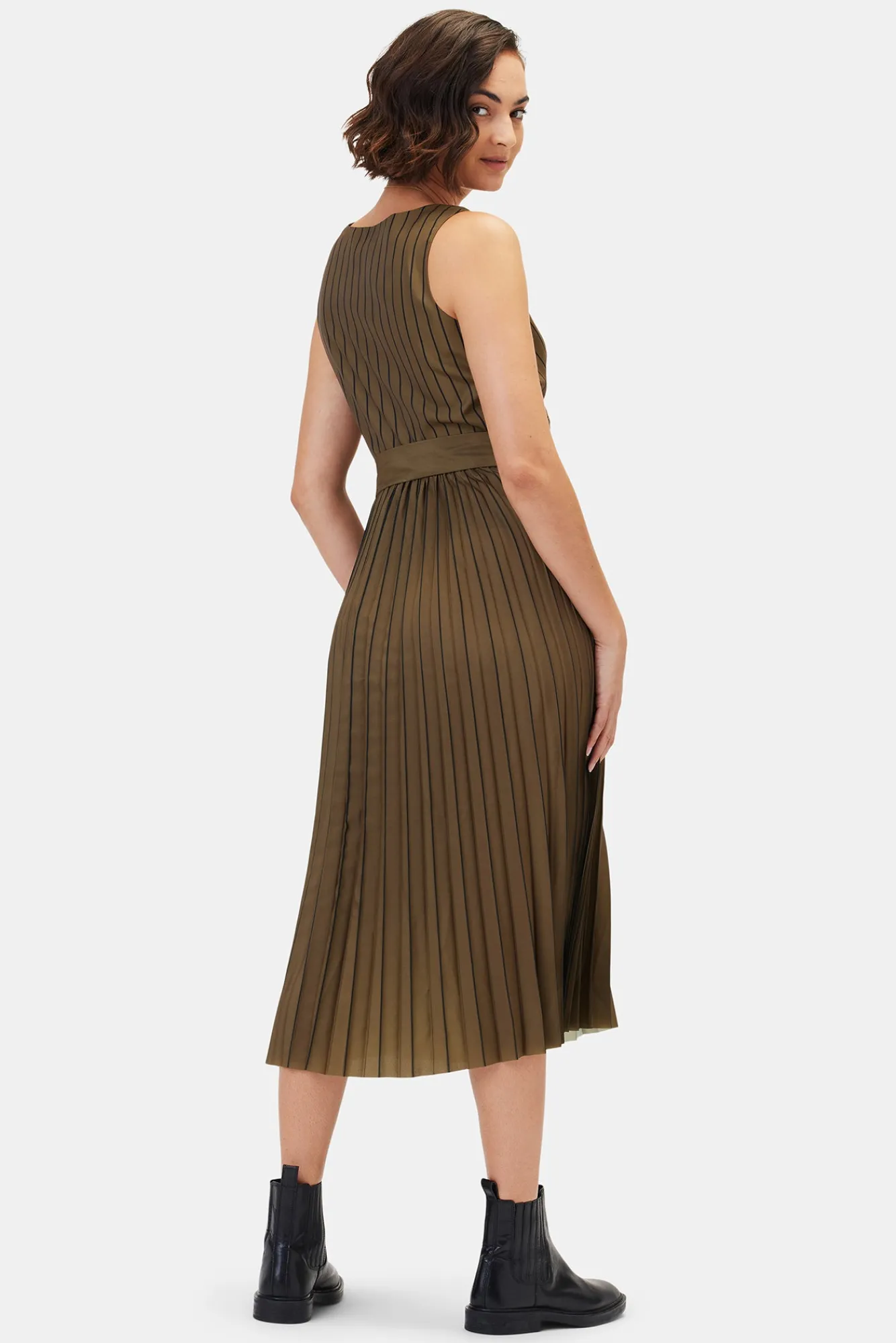 - Midi length A-line sleeveless dress with a twist surplice bodice, pleated skirt, waist tie detail, and zipper.