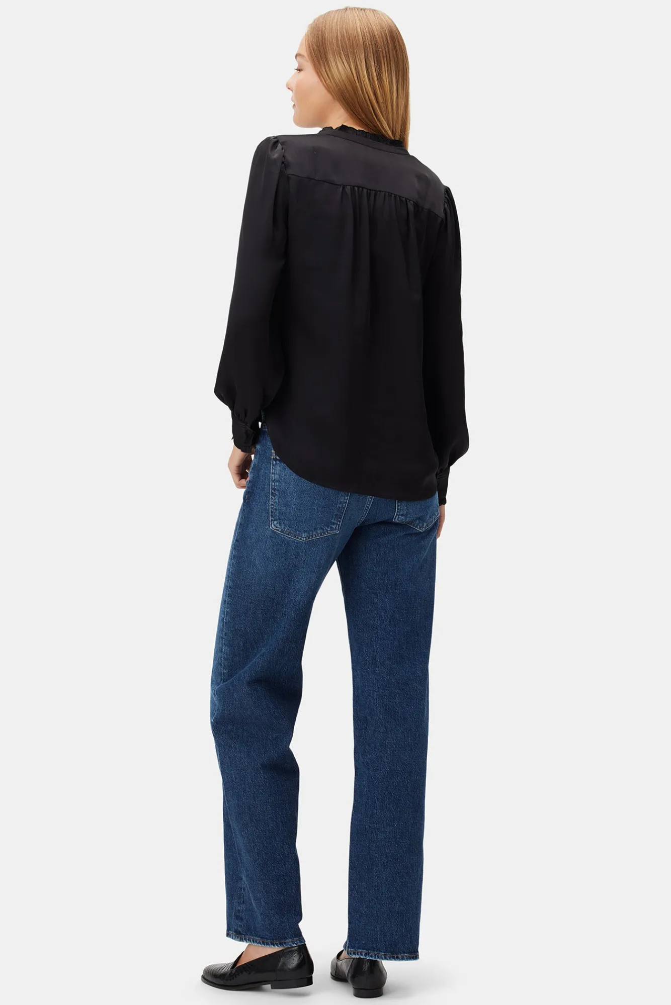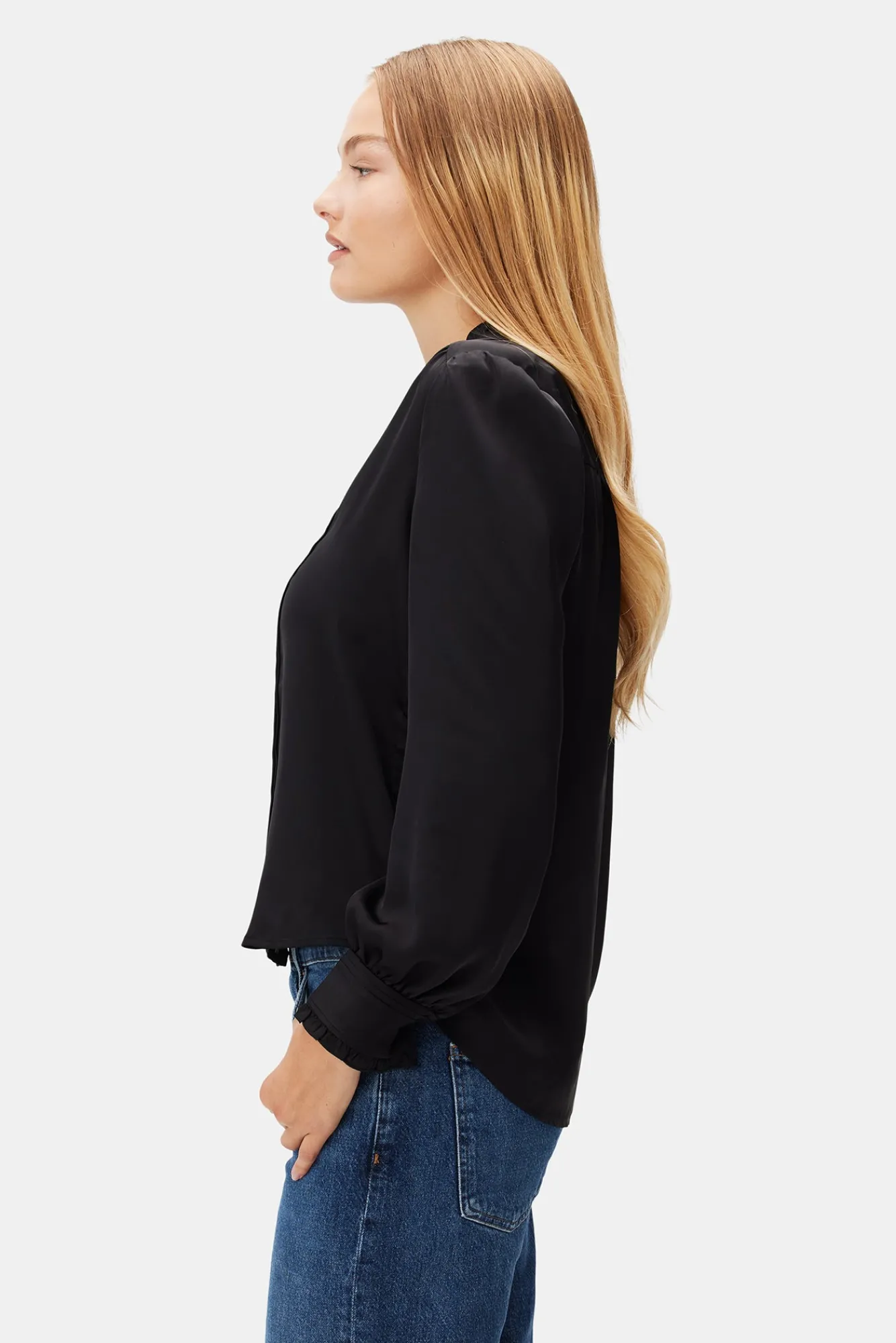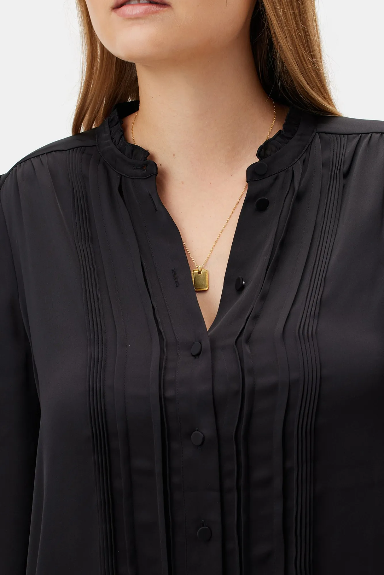 - Featuring full button front placket, slight puff sleeves and sheering at the neckline.