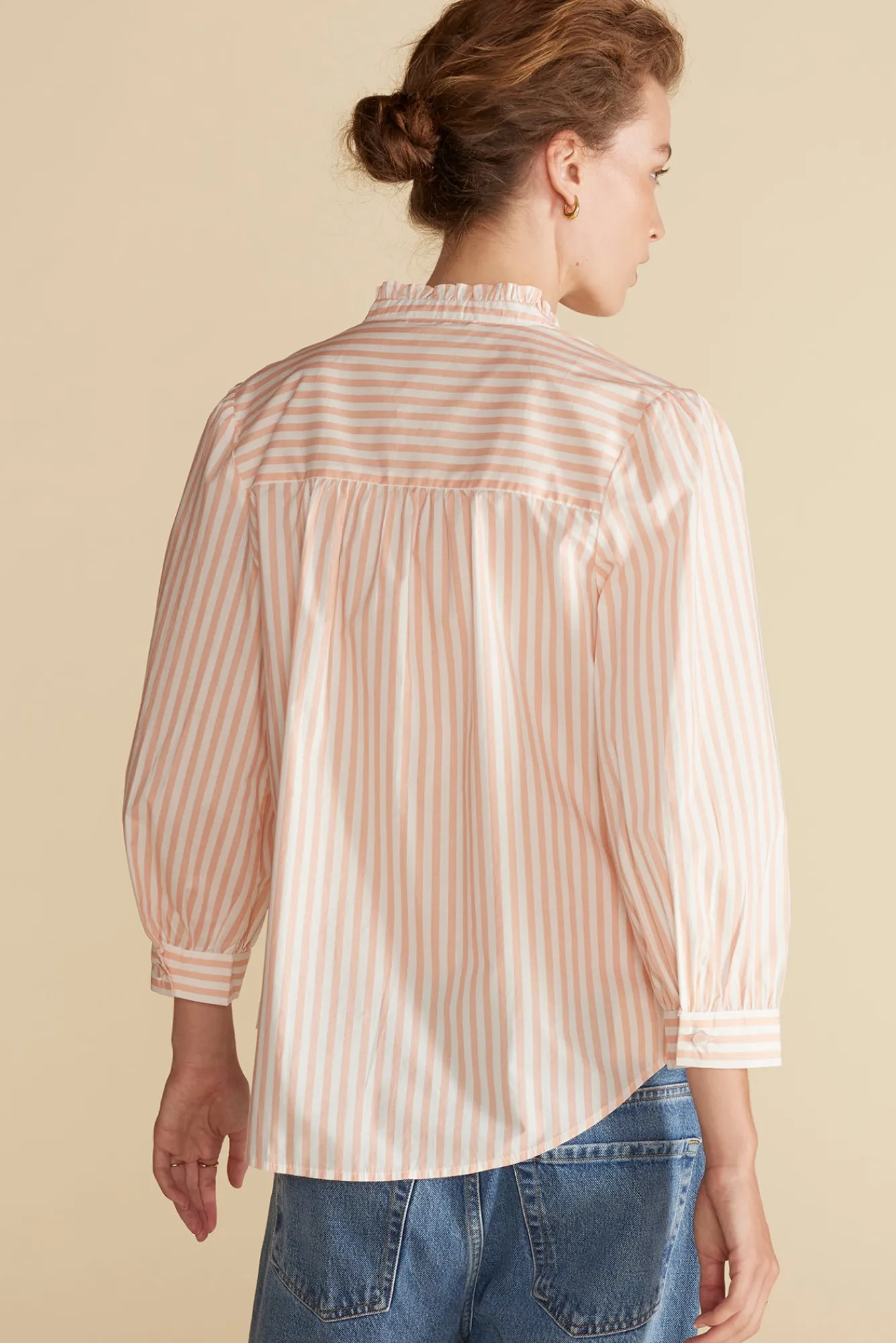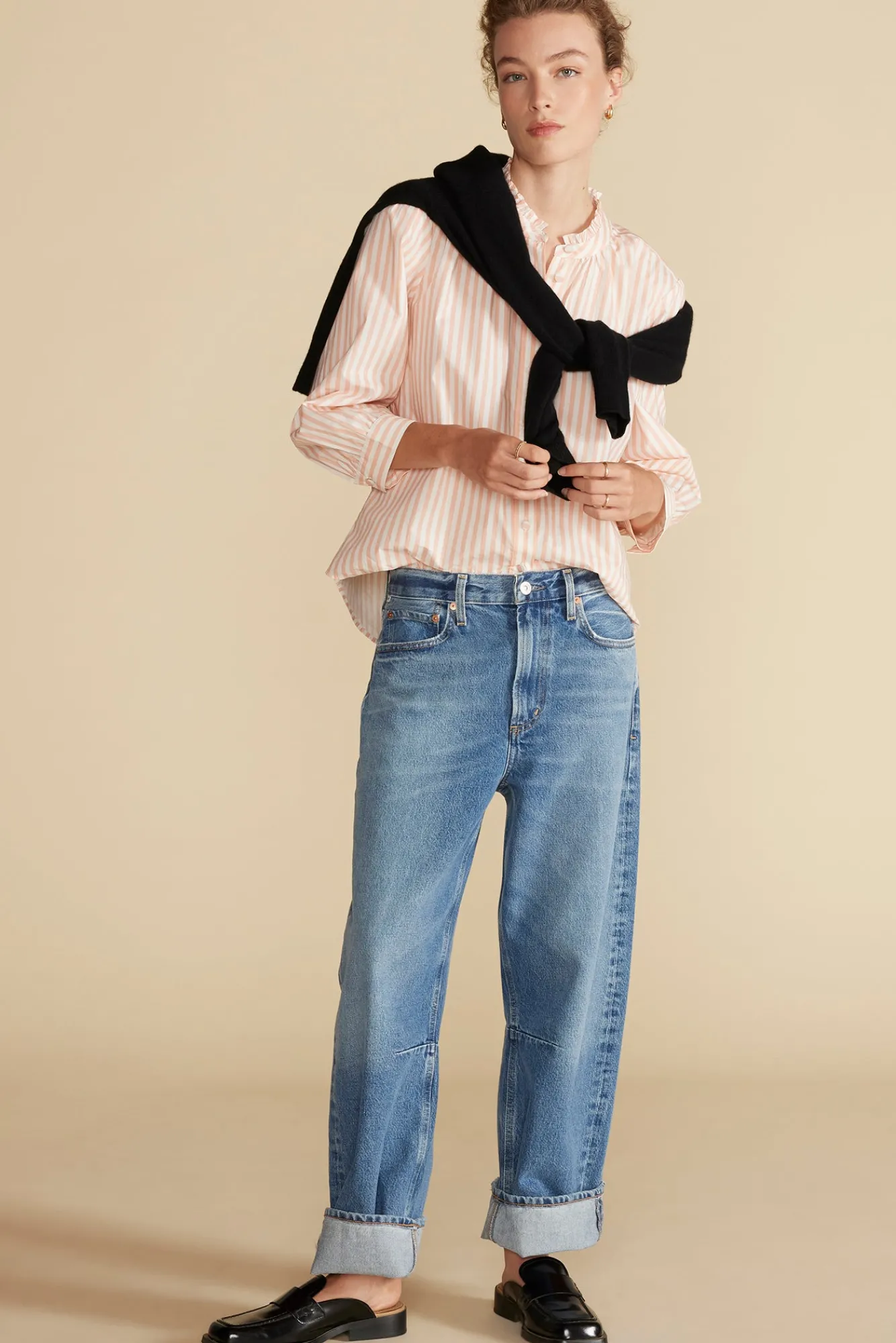 Machine WashableOrganicAn airy band collar shirt with a curved hem and delicate ruffle detailing. Relaxed yet crisp in o…