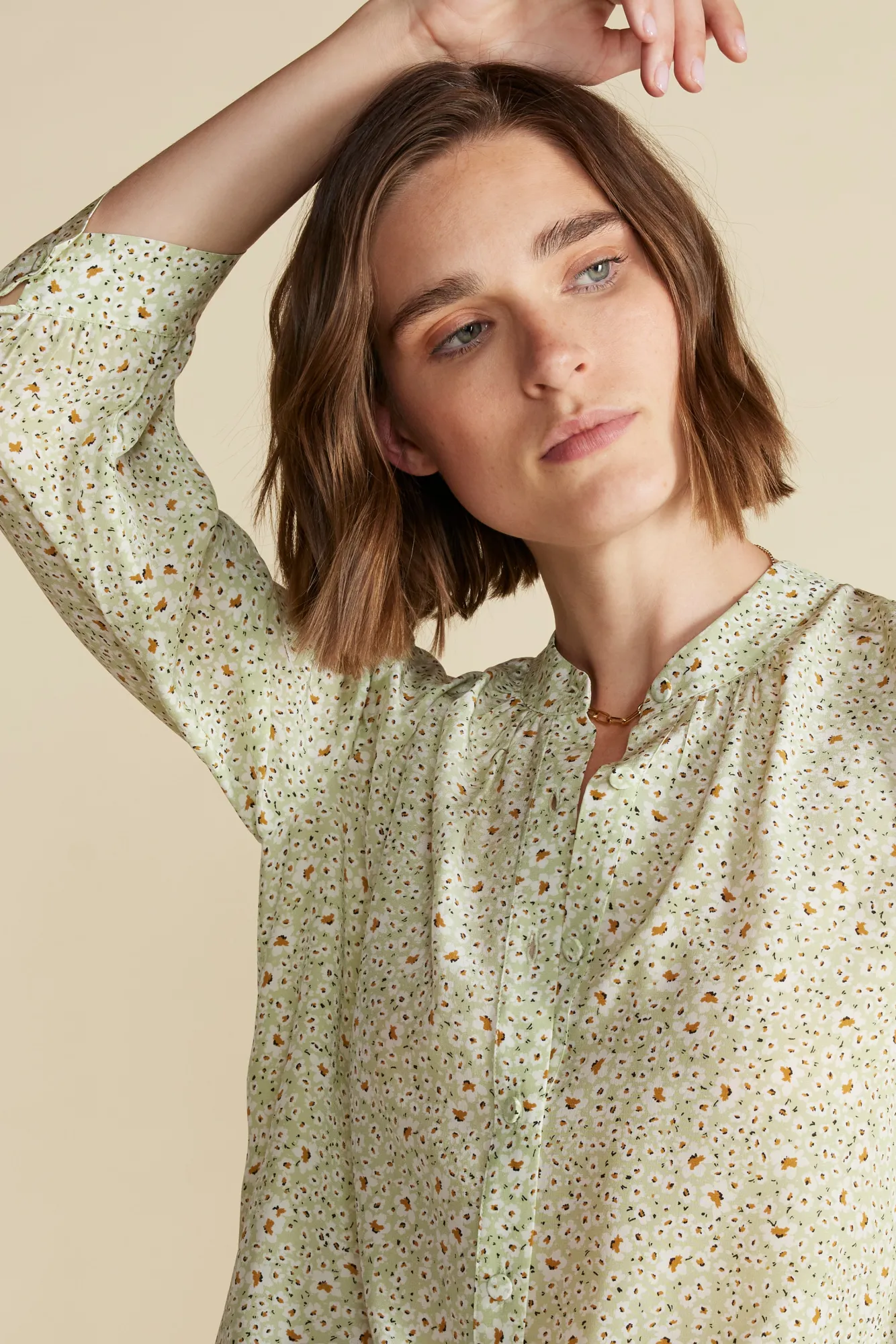 - 3/4-sleeved, relaxed fit blouse with subtle puff sleeves, covered buttons, and shirring at the neckline
