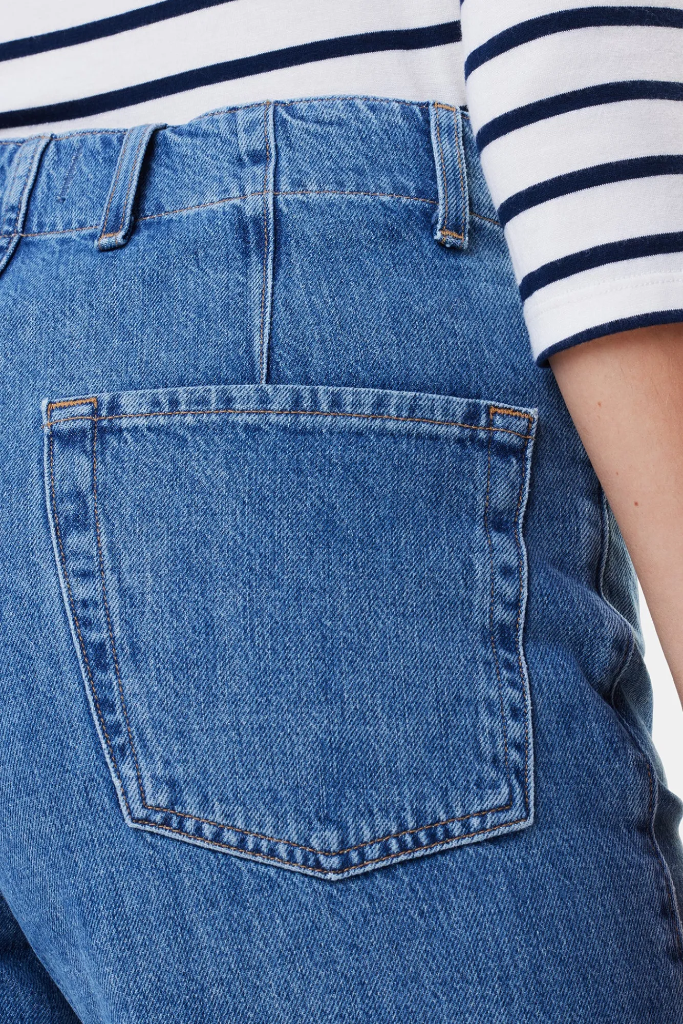 - Utility trouser jean that sits high on the waist with a voluminous, wide leg. Layer with a blazer or tailored shirting.