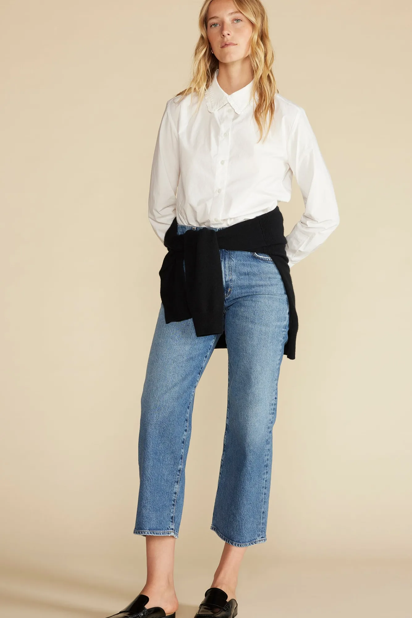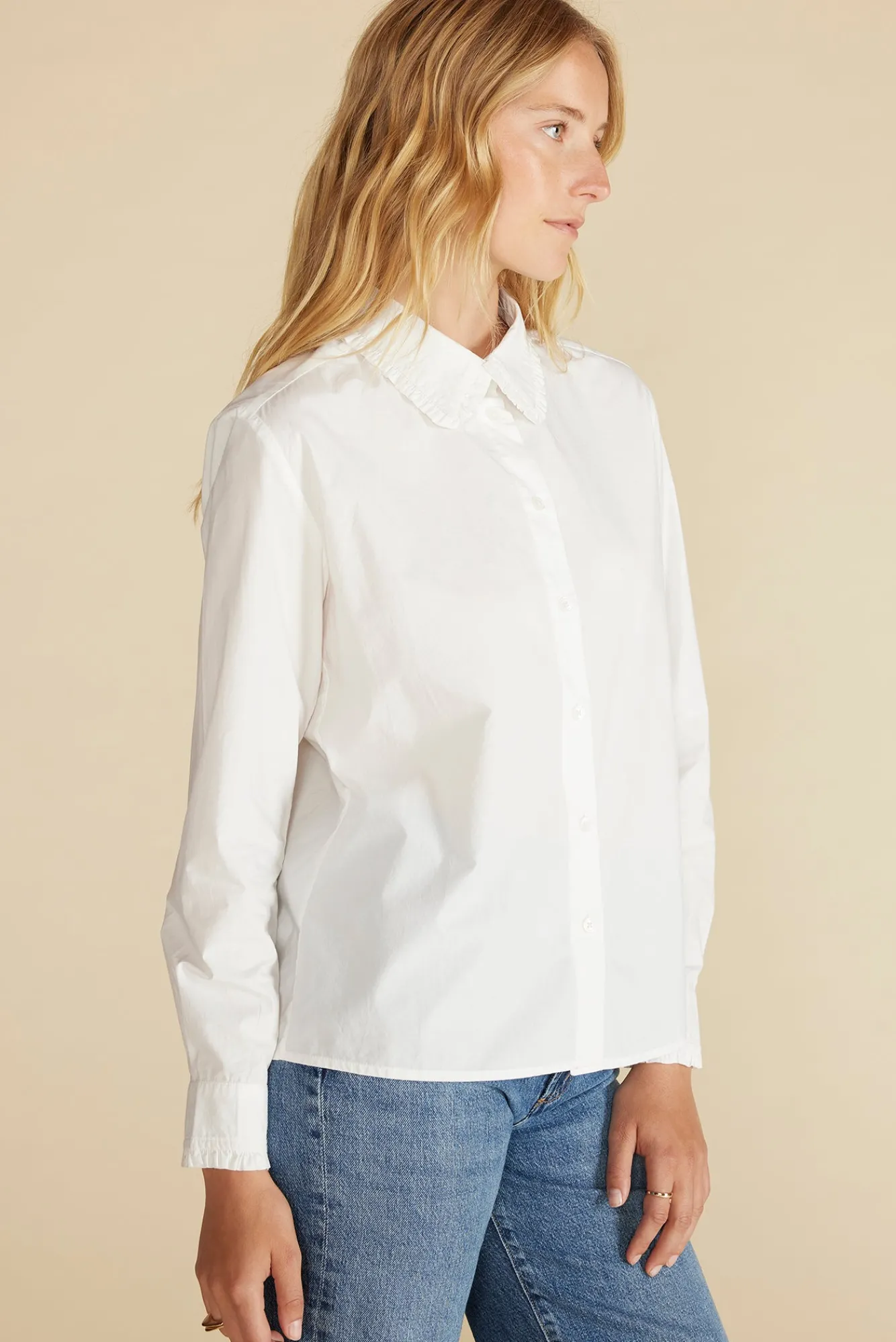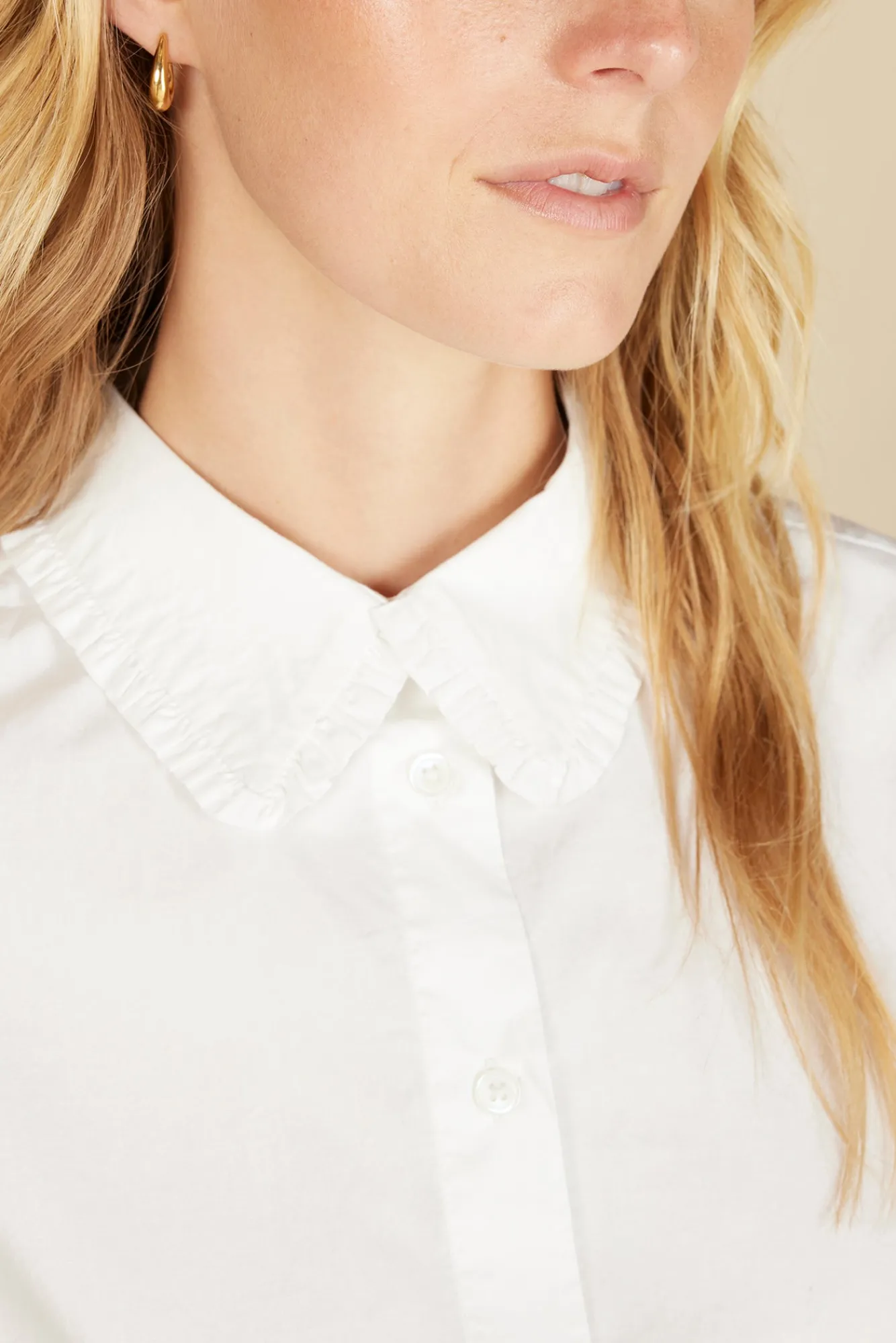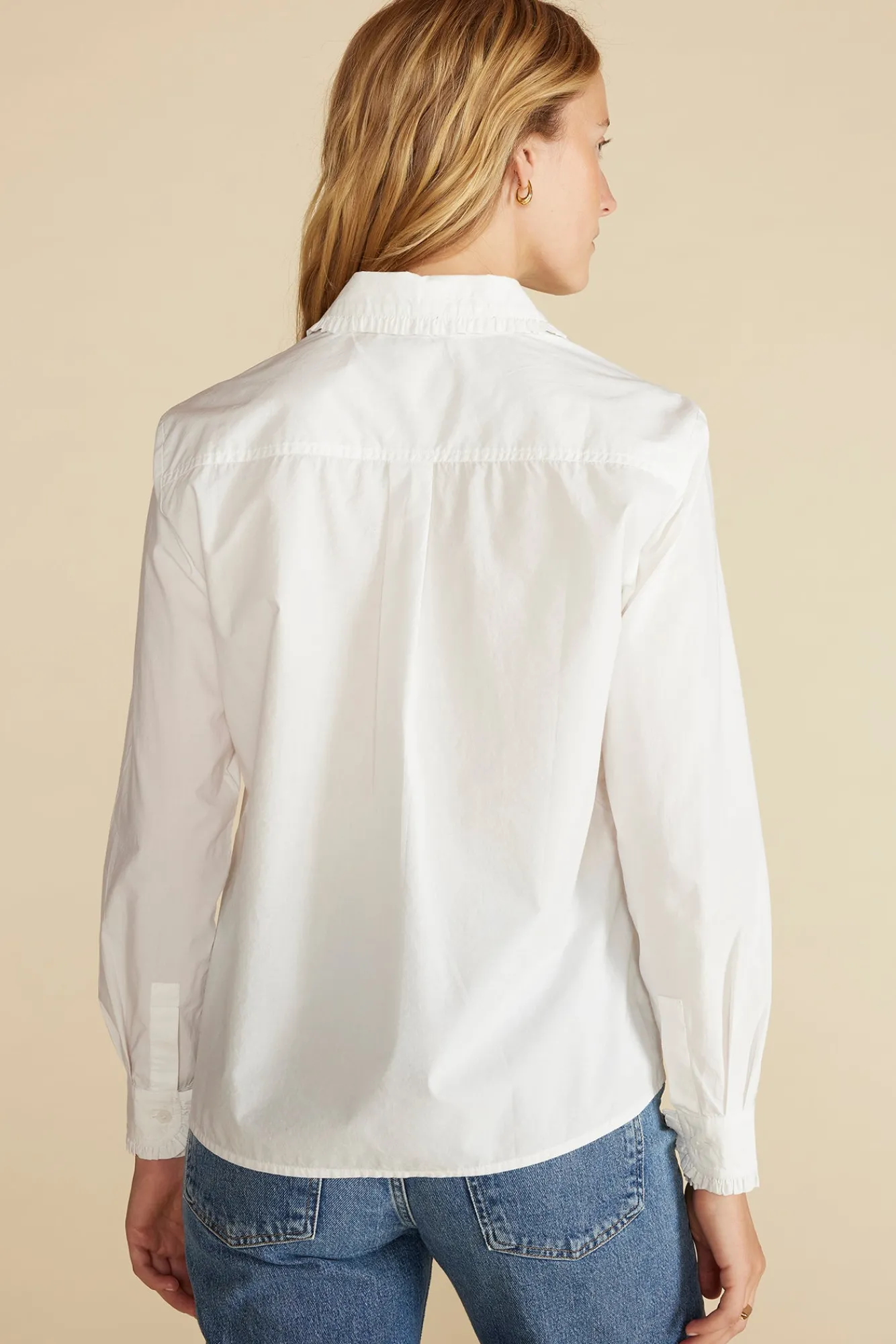 Machine WashableOrganicThe crisp cotton poplin shirt is reinvented with ruffled edges at the collar and a vertical strip…