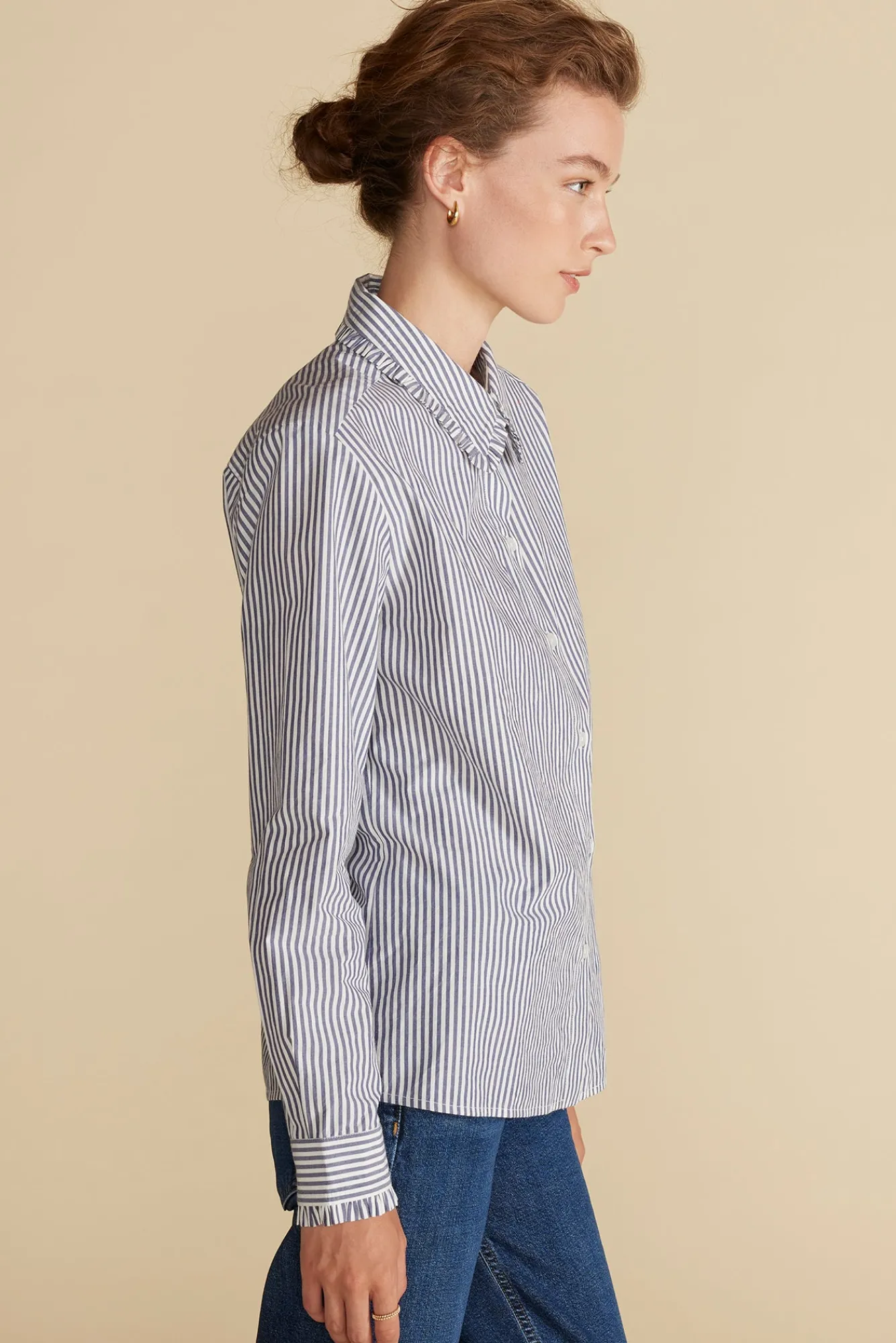 Machine WashableOrganicThe crisp cotton poplin shirt is reinvented with ruffled edges at the collar and a vertical strip…