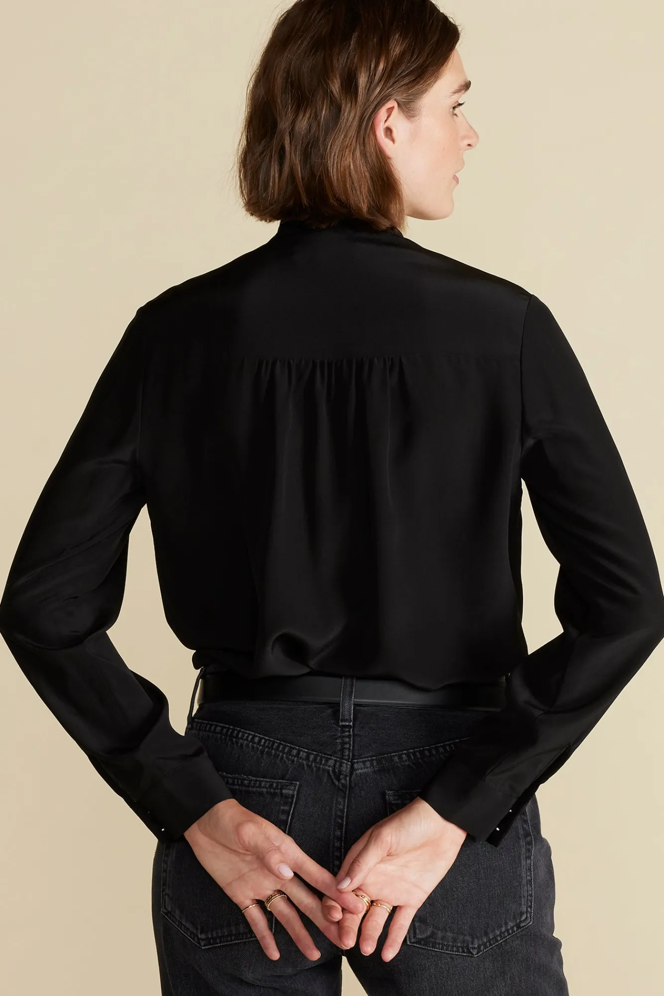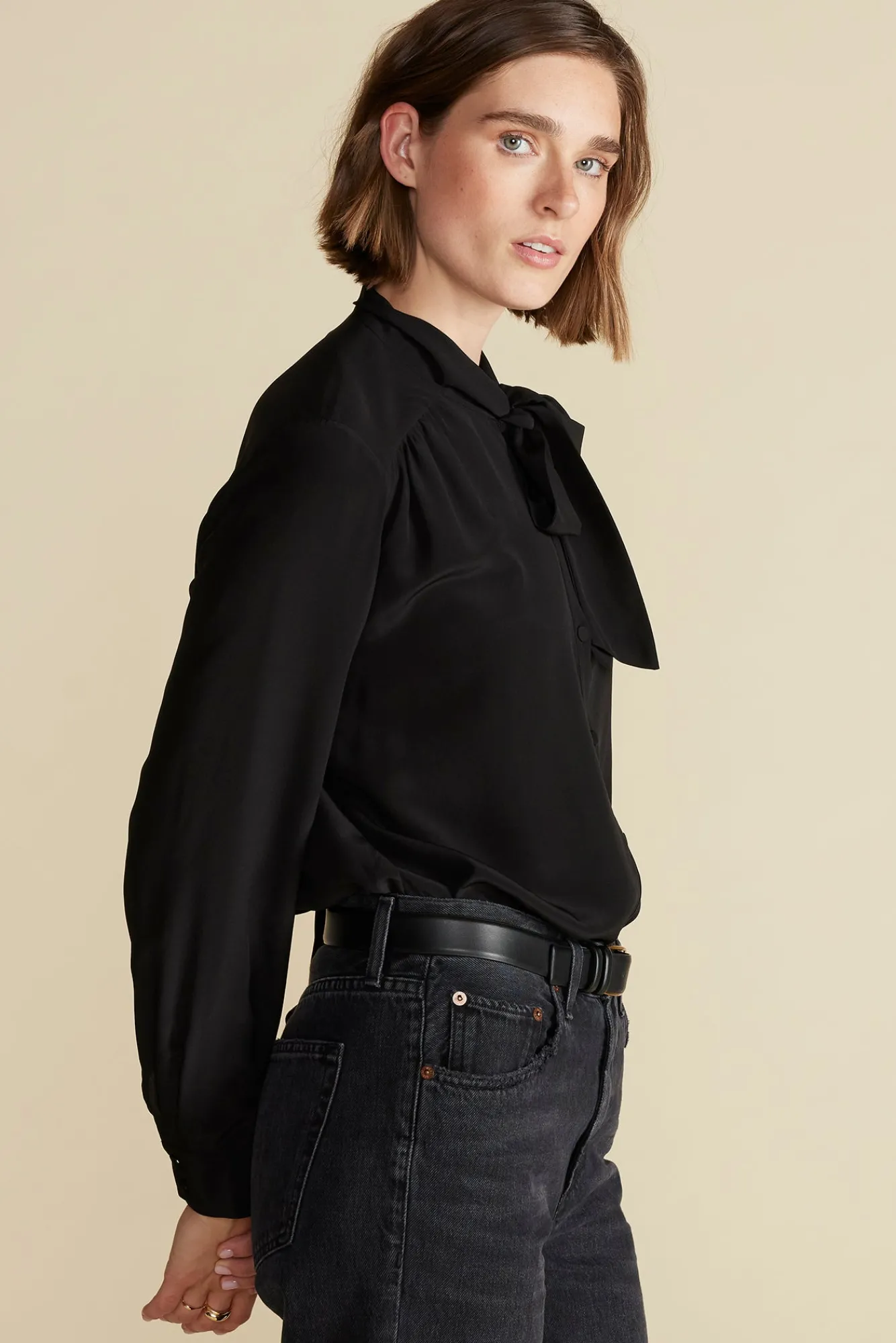 Machine WashableMake an impression with this washable silk bow blouse. The long ties at the neck and subtle puffed sleev…