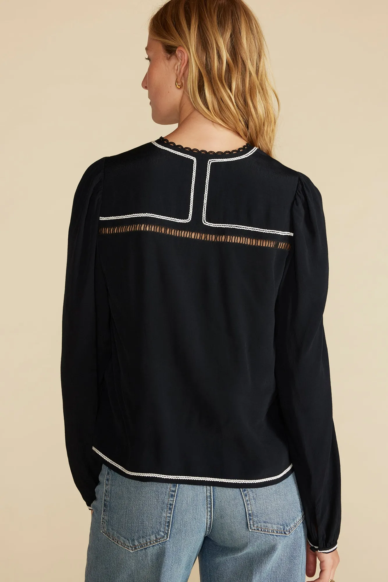 – Long sleeve crewneck blouse with shirring at the shoulders and contrast rope detailing and crochet trim at the neck, cuffs, and hem.