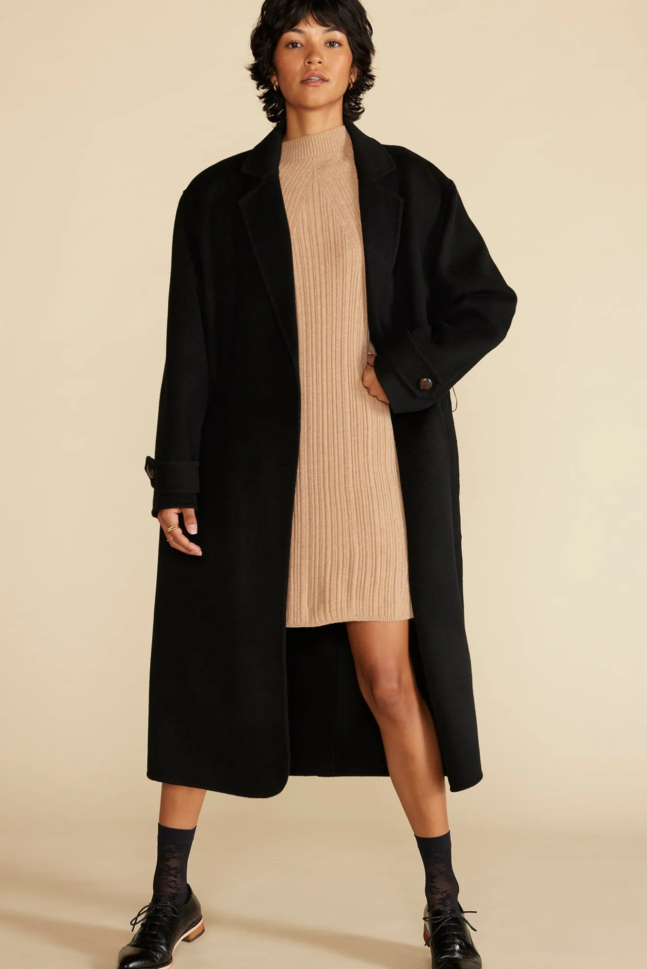 This minimal dress is elevated by its figure-skimming fit and neutral hue. It’s ideal for warmer days with simple ballet flats or with tights and boots when the temperatures drop.