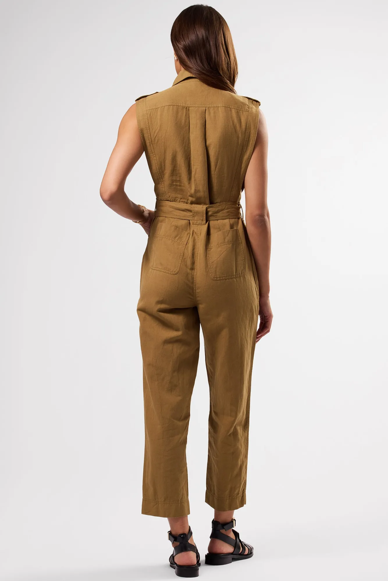 - Slim-fitting, sleeveless jumpsuit with inset shoulder detailing and front placket