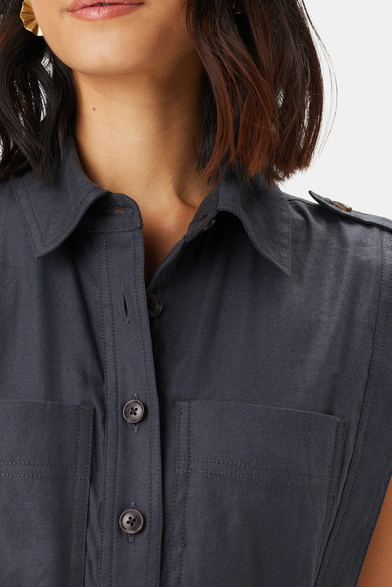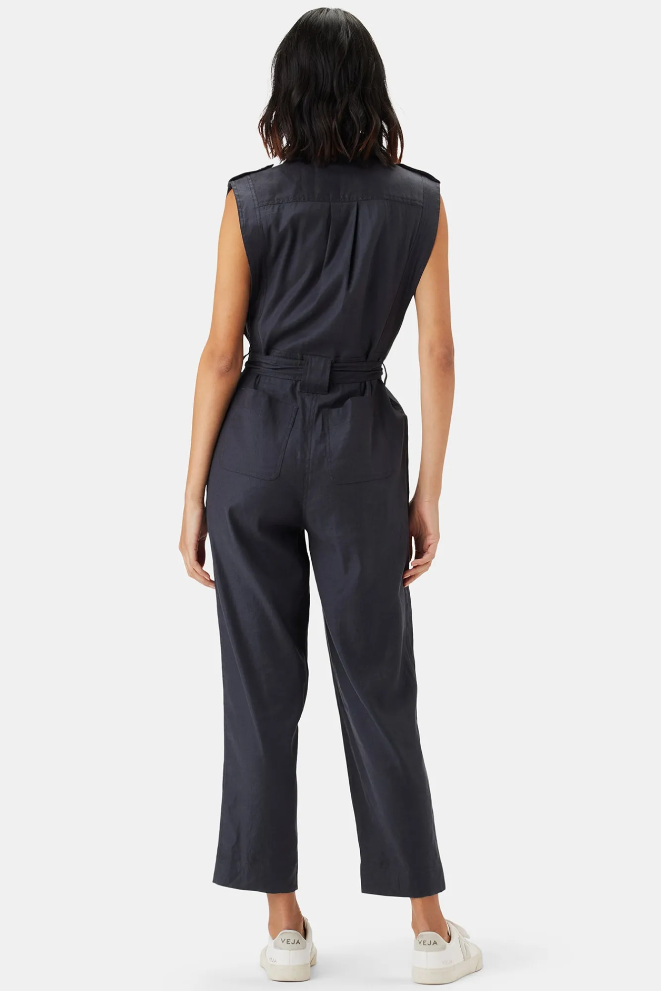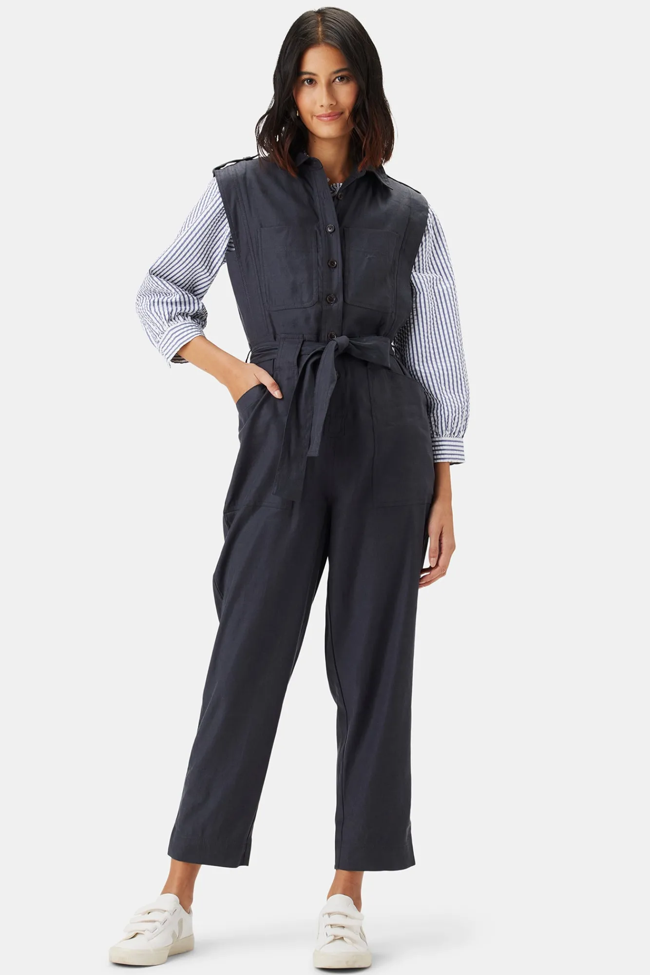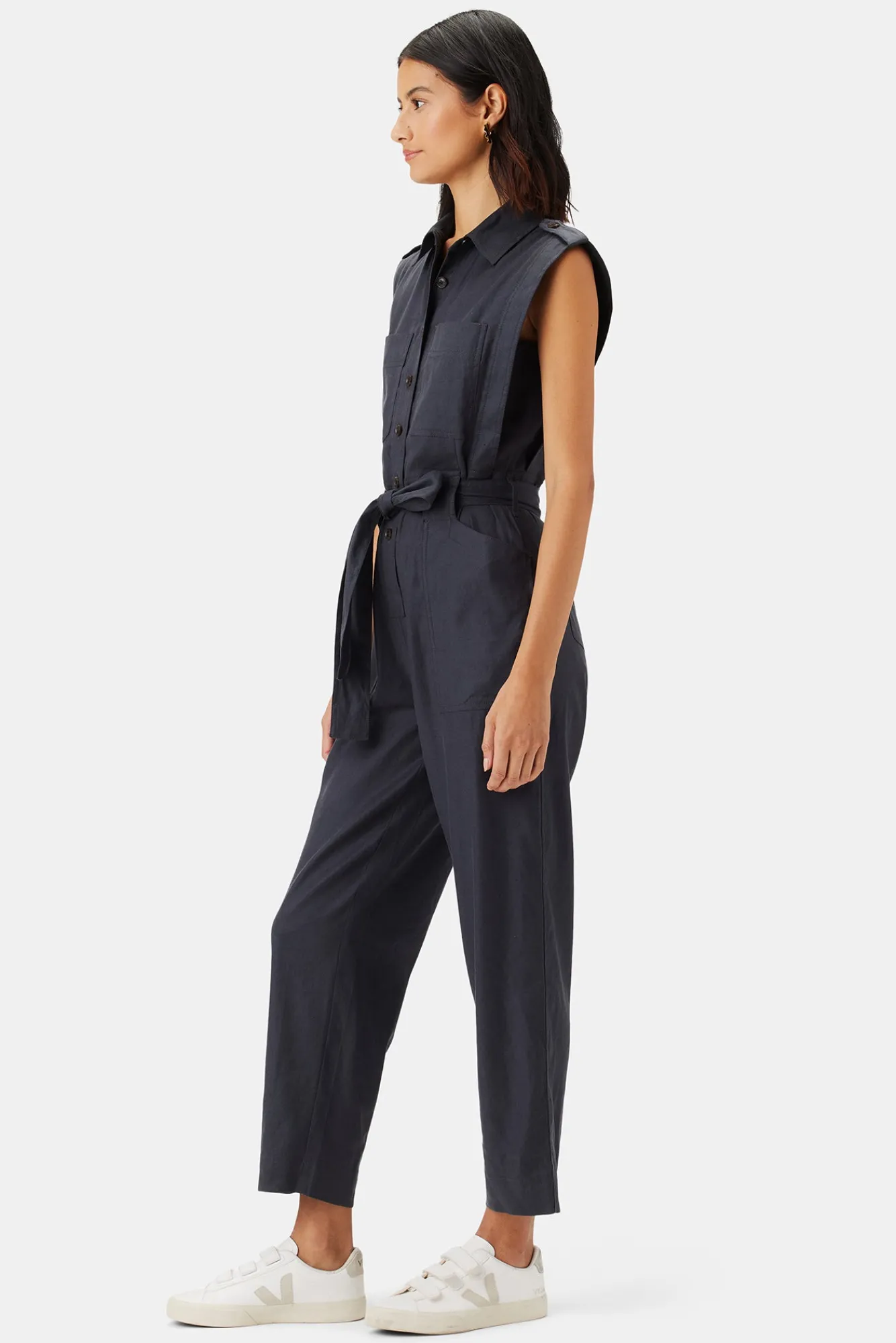 - Slim-fitting, sleeveless jumpsuit with inset shoulder detailing and front placket
