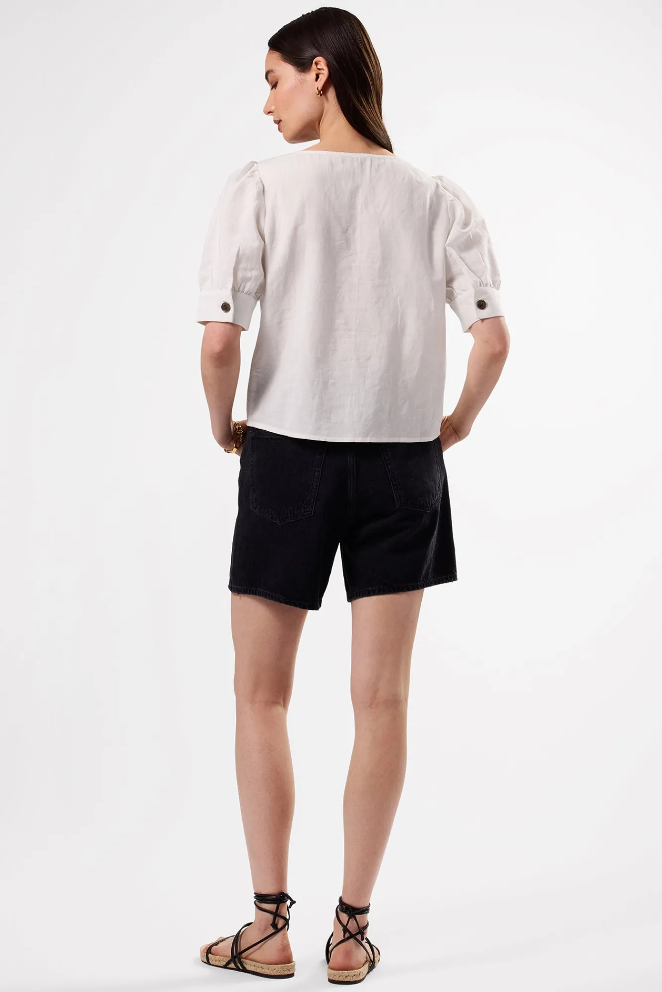 A feminine twist on the classic button-down, subtly cropped with a petite puff sleeve, perfect for pairing with high-waisted silhouettes for work or play.